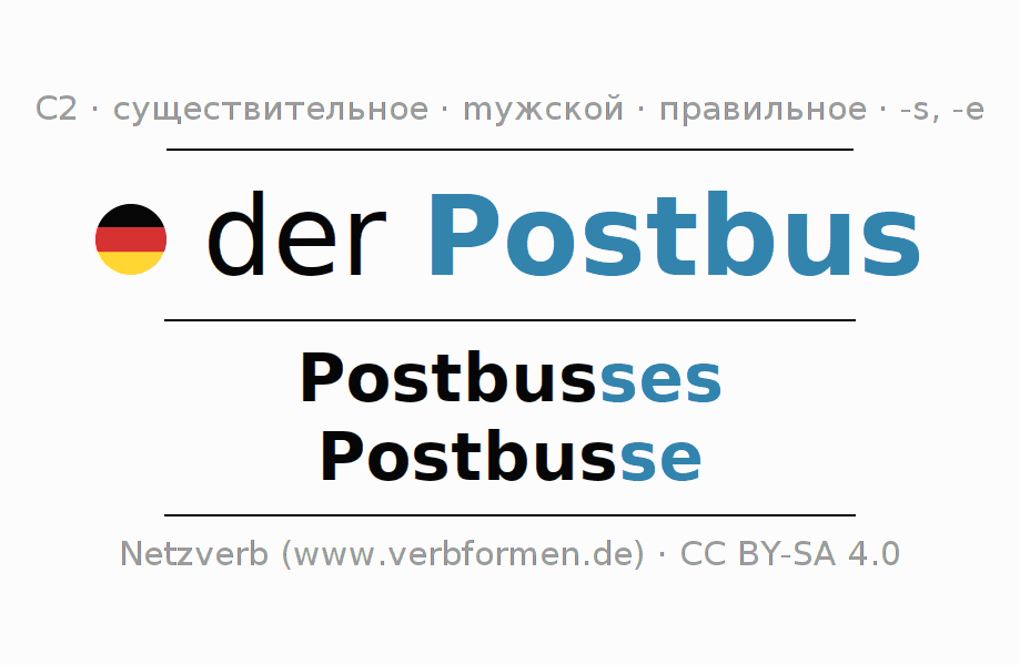 - Множественное число: die Postbusse, der Postbusse, den Postbussen, die Postbusse