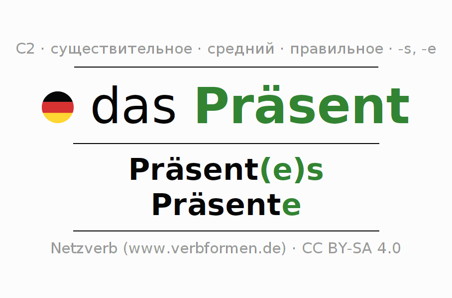 Склонение слова Präsent онлайн представлено в виде сводной таблицы со всеми формами единственного и множественного числа (множественное число) во всех четырех падежах - именительном (номинатив или 1-й падеж - кто? что?), родительном (генитив или 2-й падеж - кого? чего? чей?), дательном (датив или 3-й падеж - кому? чему?) и винительном (аккузатив или 4-й падеж - кого? что?). Материалы по склонению существительного ... могут быть использованы в качестве пособия при подготовке домашних заданий, проведении экзаменов, контрольных работ, при преподавании немецкого языка в школе, изучении немецкого языка как иностранного (DaF) и как второго (DaZ), а также при обучении взрослых. Для изучающих немецкий язык знание правильного склонения слова Präsent имеет важное значение. Более подробную информацию Вы найдёте на ... викисловаря ... и на ... в Дудене.