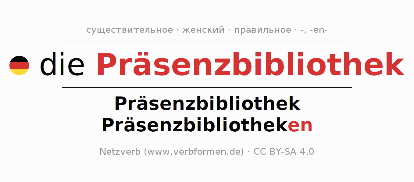 - Единственное число: die Präsenzbibliothek, der Präsenzbibliothek, der Präsenzbibliothek, die Präsenzbibliothek