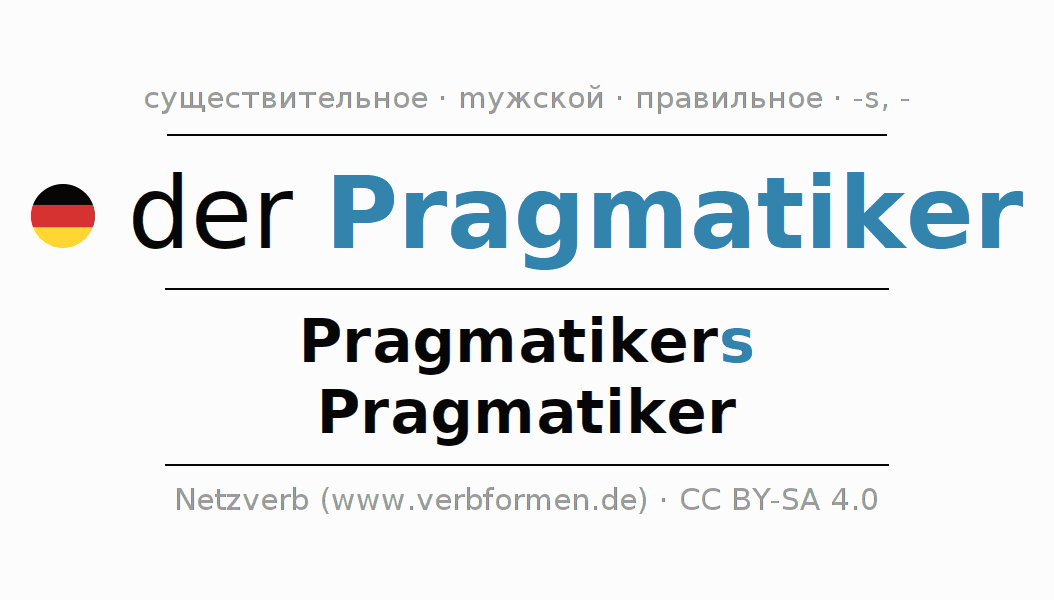 - Множественное число: die Pragmatiker, der Pragmatiker, den Pragmatikern, die Pragmatiker