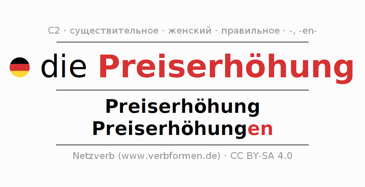 - Единственное число: die Preiserhöhung, der Preiserhöhung, der Preiserhöhung, die Preiserhöhung