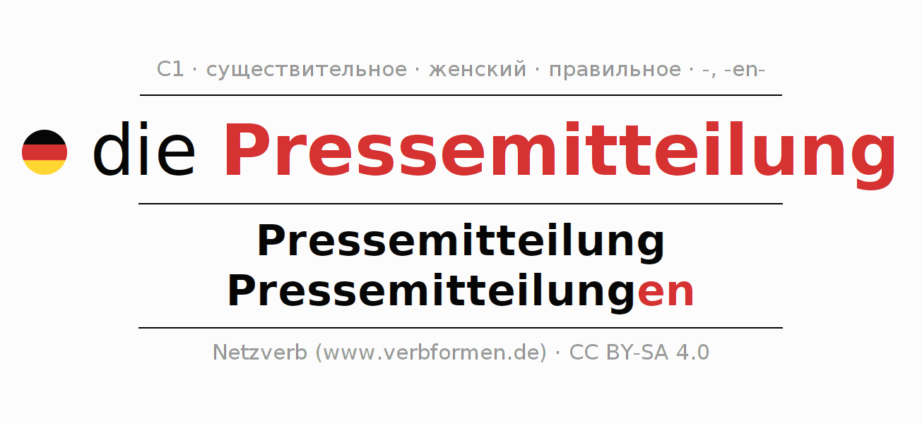 - Множественное число: die Pressemitteilungen, der Pressemitteilungen, den Pressemitteilungen, die Pressemitteilungen