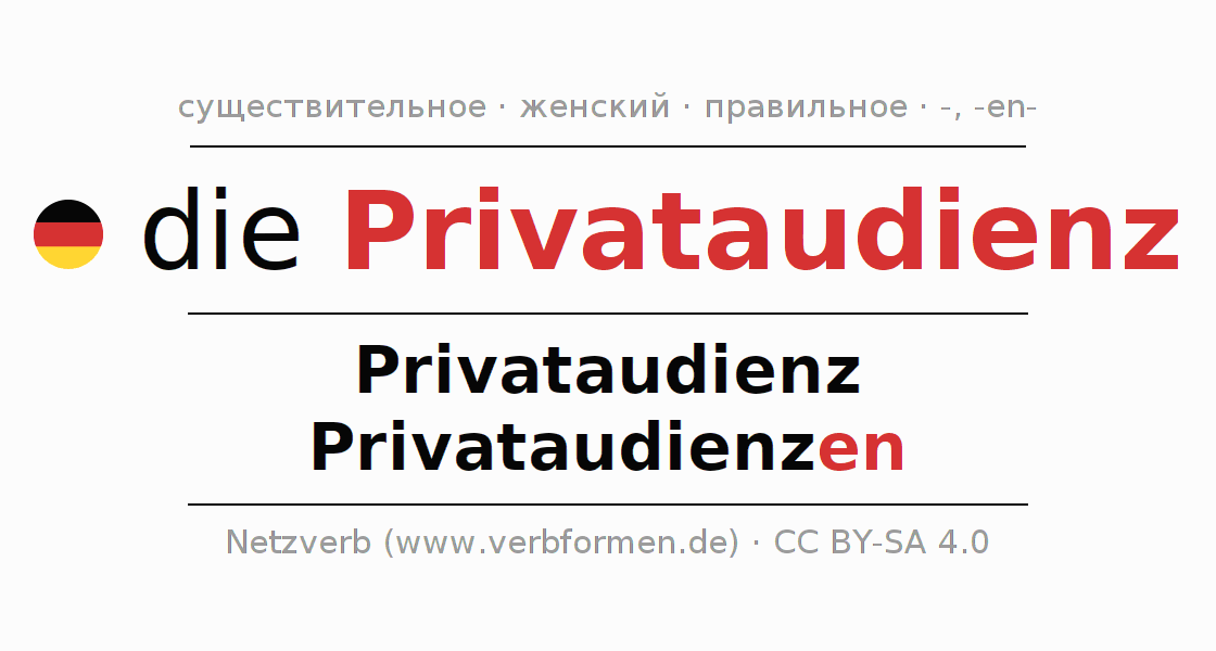 Склонение существительного Privataudienz (личная аудиенция, ча́стная аудие́нция) даётся в родительном падеже единственного числаPrivataudienz и в именительном падеже множественного числа Privataudienzen. Существительное Privataudienz склоняется по слабому типу, получая окончания -/en. Грамматический род Privataudienz женский с определённым артиклем "die" Здесь можно просклонять не только Privataudienz, но и все немецкие существительные. Kомментарии ☆