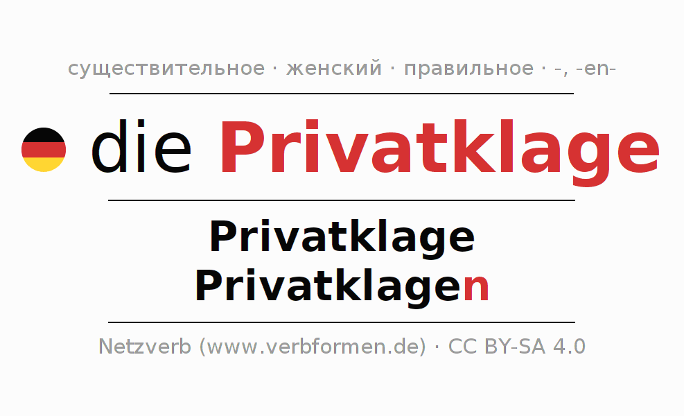 - Множественное число: die Privatklagen, der Privatklagen, den Privatklagen, die Privatklagen