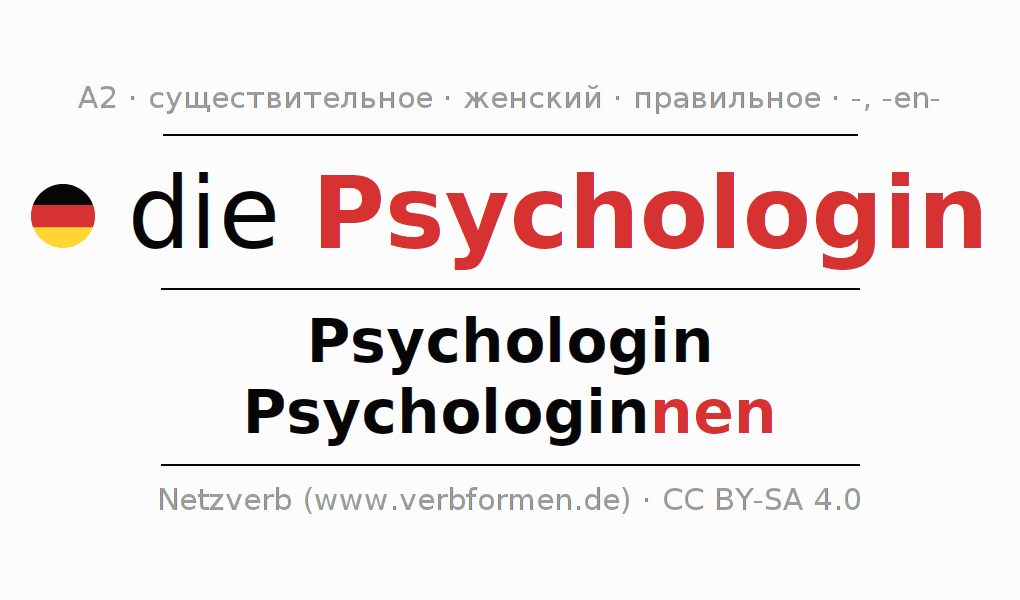 - Множественное число: die Psychologinnen, der Psychologinnen, den Psychologinnen, die Psychologinnen