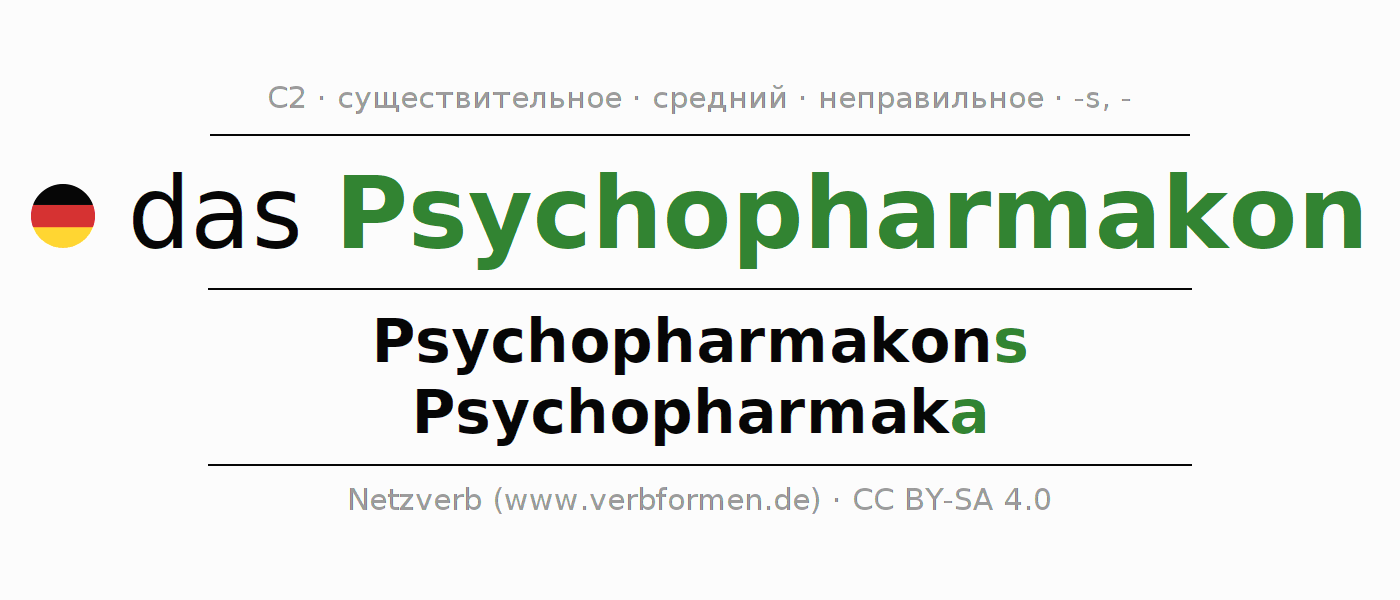 Склонение существительного Psychopharmakon (психофармакон) даётся в родительном падеже единственного числаPsychopharmakons и в именительном падеже множественного числа Psychopharmaka. Существительное Psychopharmakon при склонении получает окончания s/a. Грамматический род Psychopharmakon средний с определённым артиклем "das" Здесь можно просклонять не только Psychopharmakon, но и все немецкие существительные. Существительное включён в словарный запас обладателя сертификата знания немецкого языка уровня C2. Kомментарии ☆