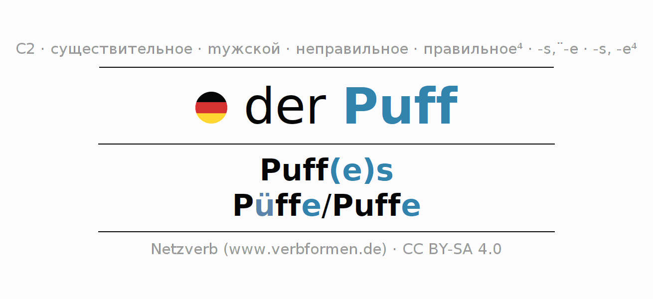Склонение существительного Puff (пух, банке́тка) даётся в родительном падеже единственного числаPuff(e)s и в именительном падеже множественного числа Püffe/Puffe. Существительное Puff склоняется по сильному типу, получая окончания es/ü-e/e. Может употребляться и с другими окончаниями. Во множественном числе стоит умлаут. Грамматический род Puff мужской с определённым артиклем "der" Однако существительное может употребляться в другом роде и с другим артиклем. Здесь можно просклонять не только Puff, но и все немецкие существительные. Существительное включён в словарный запас обладателя сертификата знания немецкого языка уровня C2. Kомментарии ☆