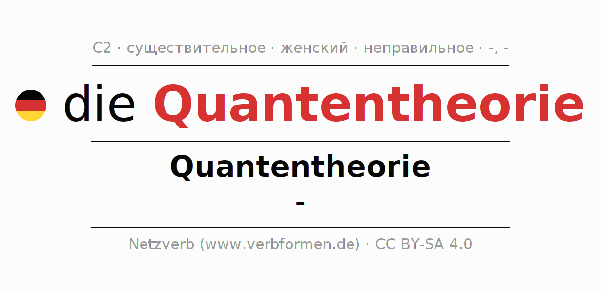 Склонение существительного Quantentheorie (квантовая теория, ква́нтовая тео́рия) даётся в родительном падеже единственного числаQuantentheorie и в именительном падеже множественного числа -. Существительное Quantentheorie при склонении получает окончания -/-. Не образует форм множественного числа. Грамматический род Quantentheorie женский с определённым артиклем "die" Здесь можно просклонять не только Quantentheorie, но и все немецкие существительные. Существительное включён в словарный запас обладателя сертификата знания немецкого языка уровня C2. Kомментарии ☆