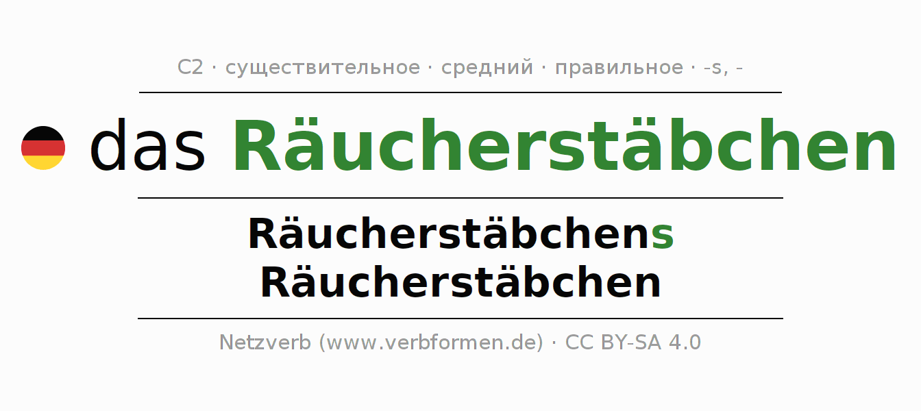 - Множественное число: die Räucherstäbchen, der Räucherstäbchen, den Räucherstäbchen, die Räucherstäbchen