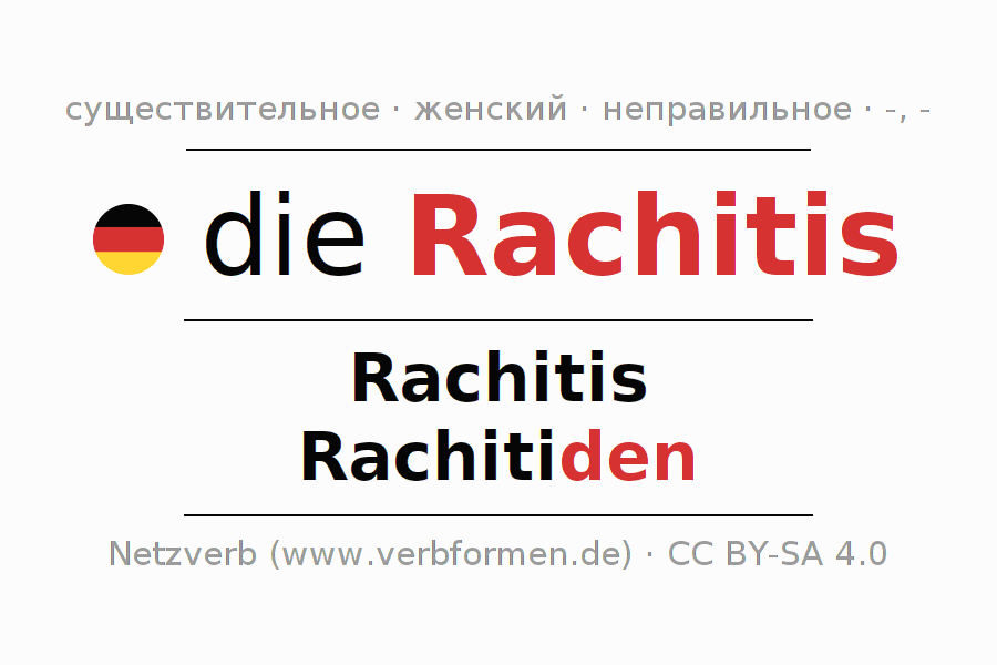 - Единственное число: die Rachitis, der Rachitis, der Rachitis, die Rachitis