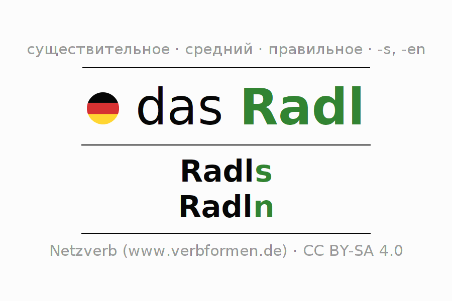 Склонение существительного Radl (ве́лик, велосипе́д) даётся в родительном падеже единственного числаRadls и в именительном падеже множественного числа Radln. Существительное Radl склоняется по смешанному типу, получая окончания s/n. Грамматический род Radl средний с определённым артиклем "das" Здесь можно просклонять не только Radl, но и все немецкие существительные. Kомментарии ☆