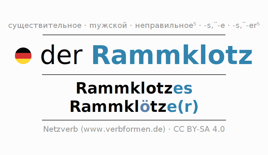 Склонение существительного Rammklotz (ба́ба копра́, молоток) даётся в родительном падеже единственного числаRammklotzes и в именительном падеже множественного числа Rammklötze(r). Существительное Rammklotz склоняется по сильному типу, получая окончания es/ö-e/ö-er. Во множественном числе стоит умлаут. Грамматический род Rammklotz мужской с определённым артиклем "der" Здесь можно просклонять не только Rammklotz, но и все немецкие существительные. Kомментарии ☆
