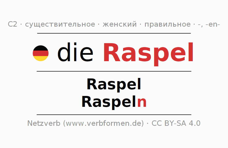 - Единственное число: die Raspel, der Raspel, der Raspel, die Raspel