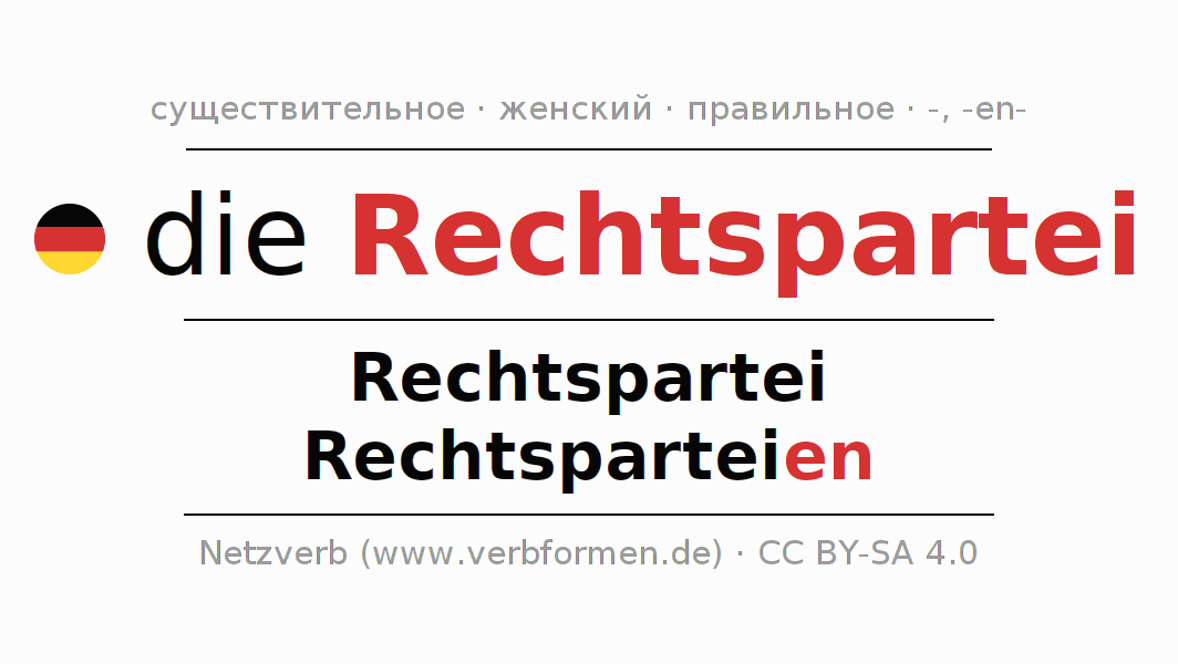- Множественное число: die Rechtsparteien, der Rechtsparteien, den Rechtsparteien, die Rechtsparteien