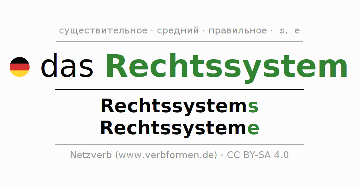 - Множественное число: die Rechtssysteme, der Rechtssysteme, den Rechtssystemen, die Rechtssysteme