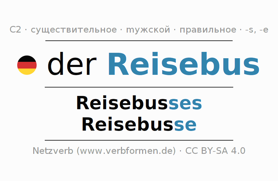 - Множественное число: die Reisebusse, der Reisebusse, den Reisebussen, die Reisebusse