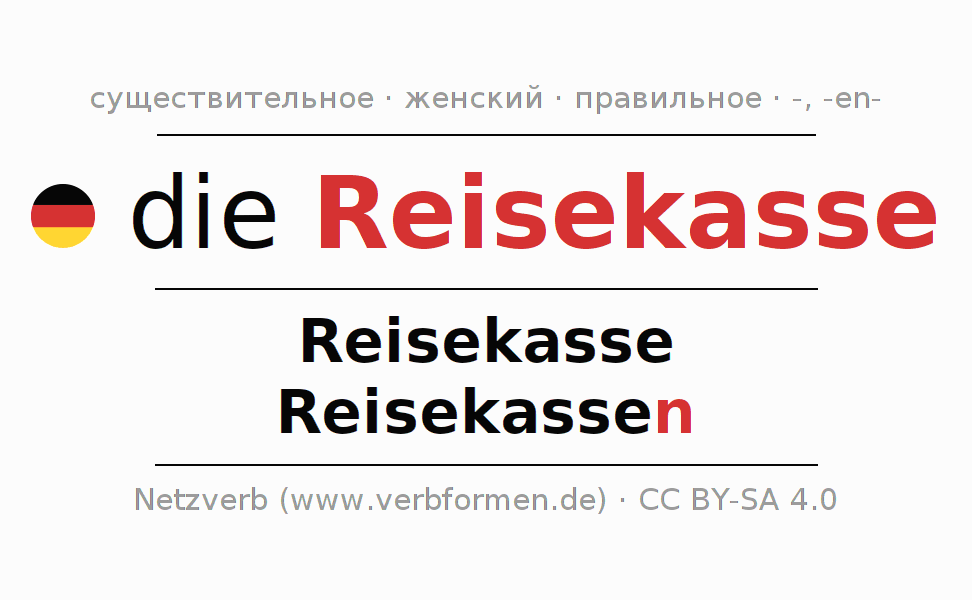 Склонение существительного Reisekasse (деньги на поездку, путевые деньги) даётся в родительном падеже единственного числаReisekasse и в именительном падеже множественного числа Reisekassen. Существительное Reisekasse склоняется по слабому типу, получая окончания -/n. Грамматический род Reisekasse женский с определённым артиклем "die" Здесь можно просклонять не только Reisekasse, но и все немецкие существительные. Kомментарии ☆