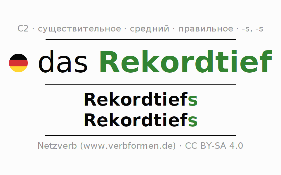 - Множественное число: die Rekordtiefs, der Rekordtiefs, den Rekordtiefs, die Rekordtiefs