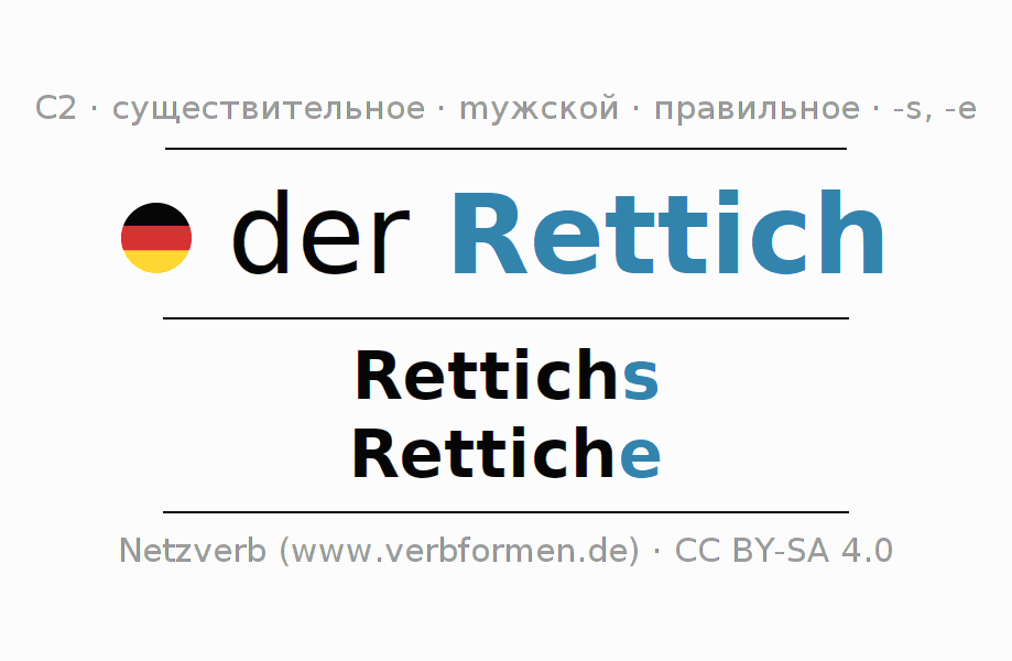 - Единственное число: der Rettich, des Rettichs, dem Rettich, den Rettich