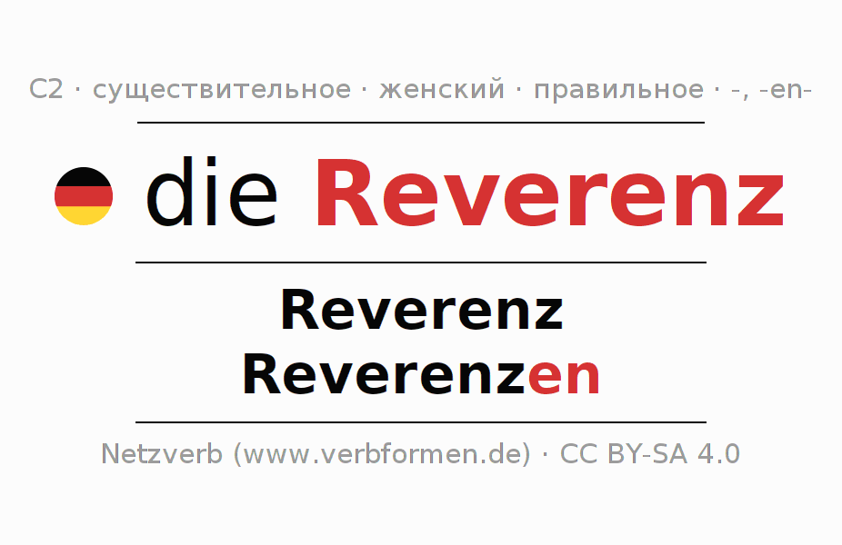 Склонение существительного Reverenz (покло́н, почте́ние) даётся в родительном падеже единственного числаReverenz и в именительном падеже множественного числа Reverenzen. Существительное Reverenz склоняется по слабому типу, получая окончания -/en. Грамматический род Reverenz женский с определённым артиклем "die" Здесь можно просклонять не только Reverenz, но и все немецкие существительные. Существительное включён в словарный запас обладателя сертификата знания немецкого языка уровня C2. Kомментарии ☆
