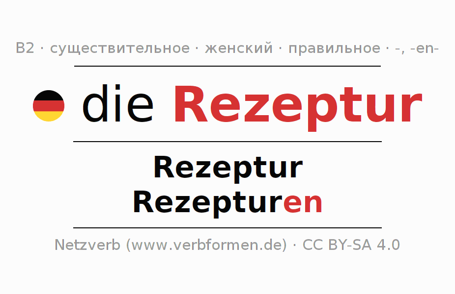 - Единственное число: die Rezeptur, der Rezeptur, der Rezeptur, die Rezeptur
