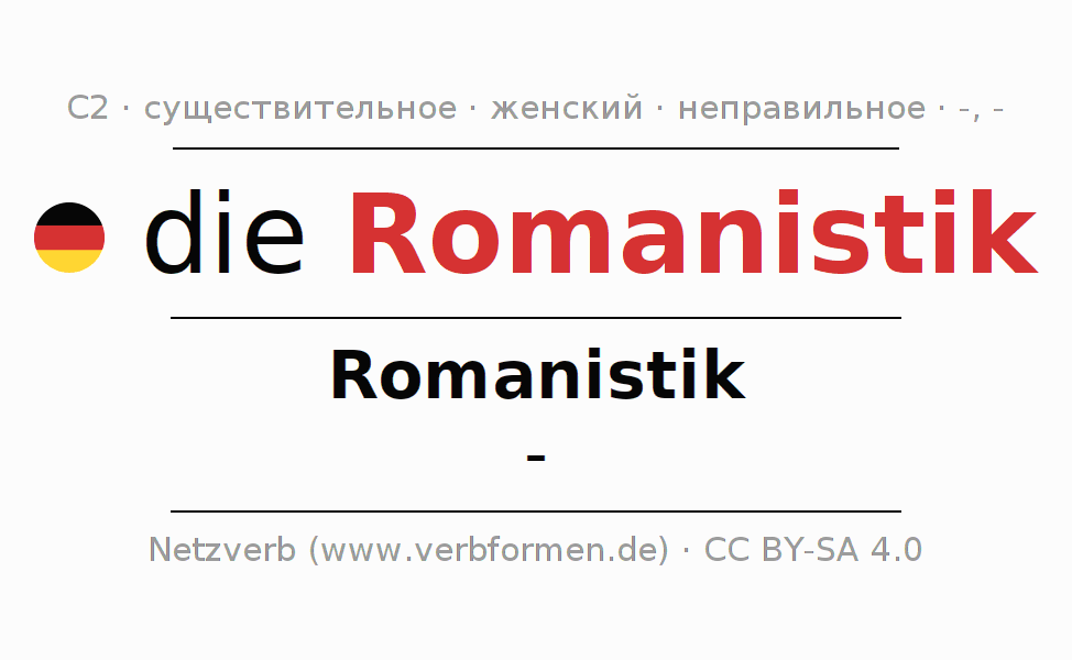 Склонение существительного Romanistik (романистика, романи́стика) даётся в родительном падеже единственного числаRomanistik и в именительном падеже множественного числа -. Существительное Romanistik при склонении получает окончания -/-. Не образует форм множественного числа. Грамматический род Romanistik женский с определённым артиклем "die" Здесь можно просклонять не только Romanistik, но и все немецкие существительные. Существительное включён в словарный запас обладателя сертификата знания немецкого языка уровня C2. Kомментарии ☆