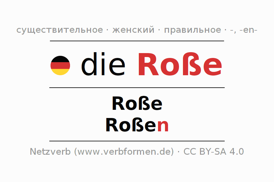 Склонение существительного Roße даётся в родительном падеже единственного числаRoße и в именительном падеже множественного числа Roßen. Существительное Roße склоняется по слабому типу, получая окончания -/n. Грамматический род Roße женский с определённым артиклем "die" Здесь можно просклонять не только Roße, но и все немецкие существительные. Kомментарии ☆