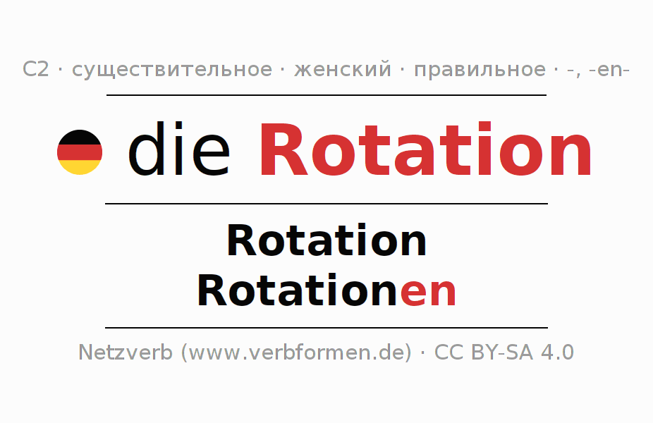- Единственное число: die Rotation, der Rotation, der Rotation, die Rotation