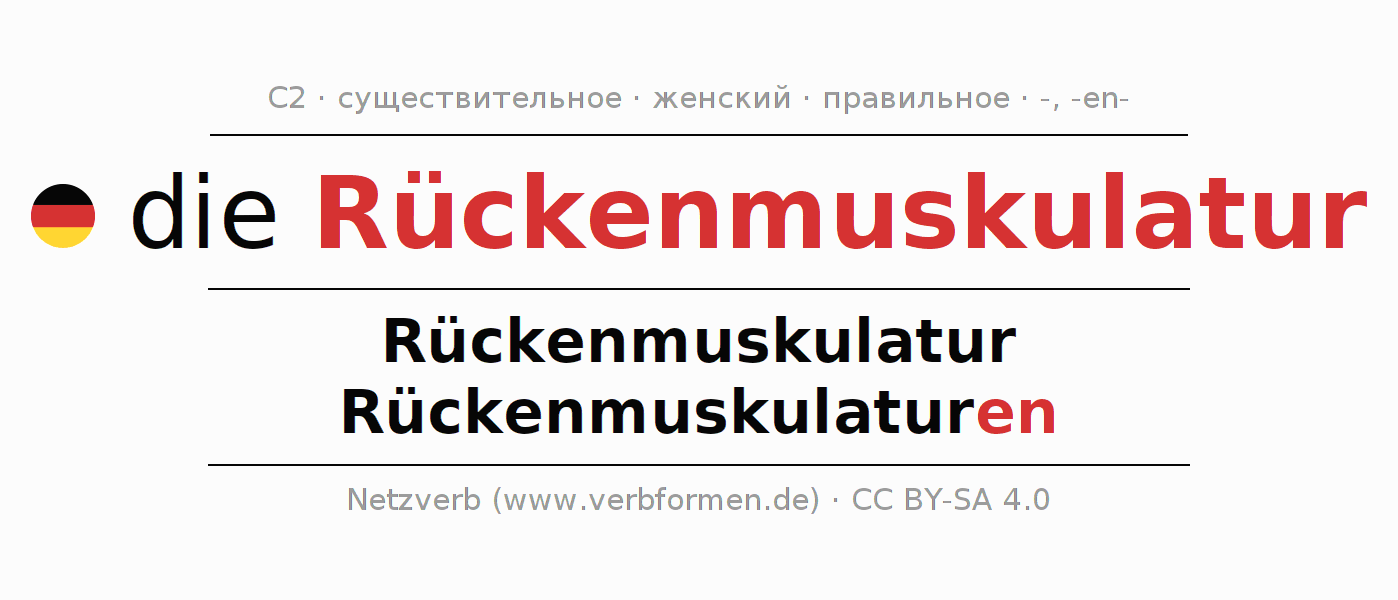 Склонение существительного Rückenmuskulatur (мы́шцы спины́, мышцы спины) даётся в родительном падеже единственного числаRückenmuskulatur и в именительном падеже множественного числа Rückenmuskulaturen. Существительное Rückenmuskulatur склоняется по слабому типу, получая окончания -/en. Грамматический род Rückenmuskulatur женский с определённым артиклем "die" Здесь можно просклонять не только Rückenmuskulatur, но и все немецкие существительные. Существительное включён в словарный запас обладателя сертификата знания немецкого языка уровня C2. Kомментарии ☆
