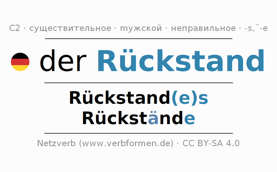 Склонение существительного Rückstand (задолженность, остатки) даётся в родительном падеже единственного числаRückstand(e)s и в именительном падеже множественного числа Rückstände. Существительное Rückstand склоняется по сильному типу, получая окончания es/ä-e. Во множественном числе стоит умлаут. Грамматический род Rückstand мужской с определённым артиклем "der" Здесь можно просклонять не только Rückstand, но и все немецкие существительные. Существительное включён в словарный запас обладателя сертификата знания немецкого языка уровня C2. Kомментарии ☆
