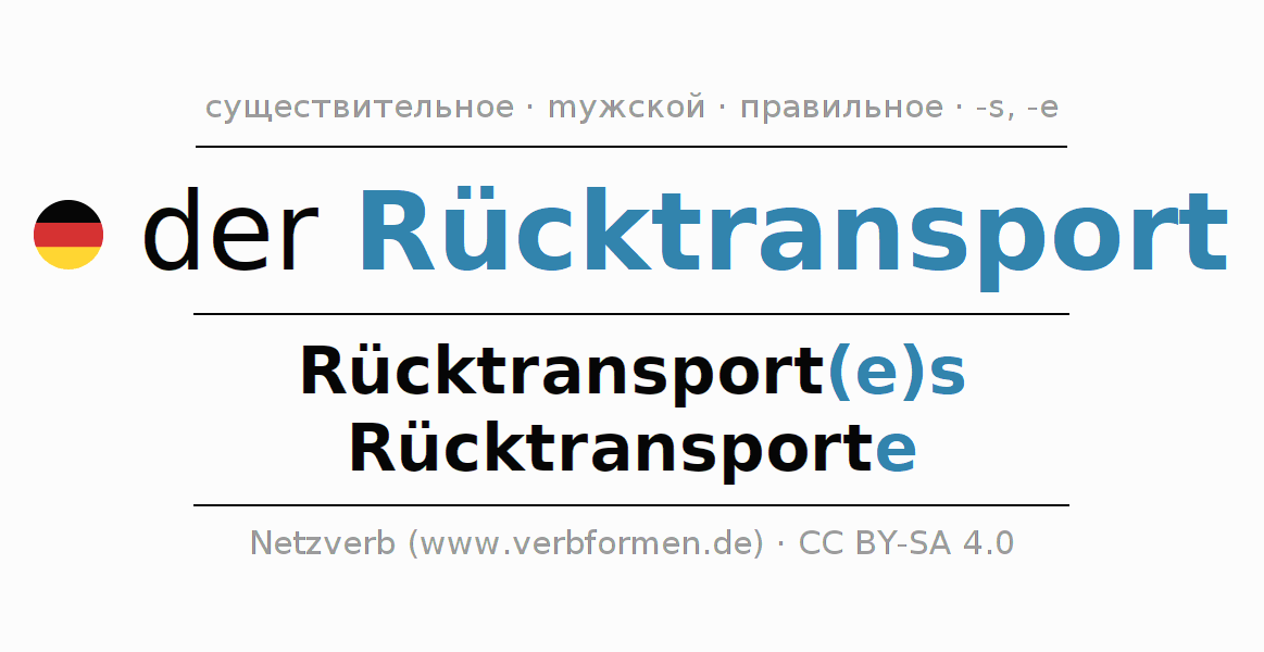 - Единственное число: der Rücktransport, des Rücktransport(e)s, dem Rücktransport(e), den Rücktransport
