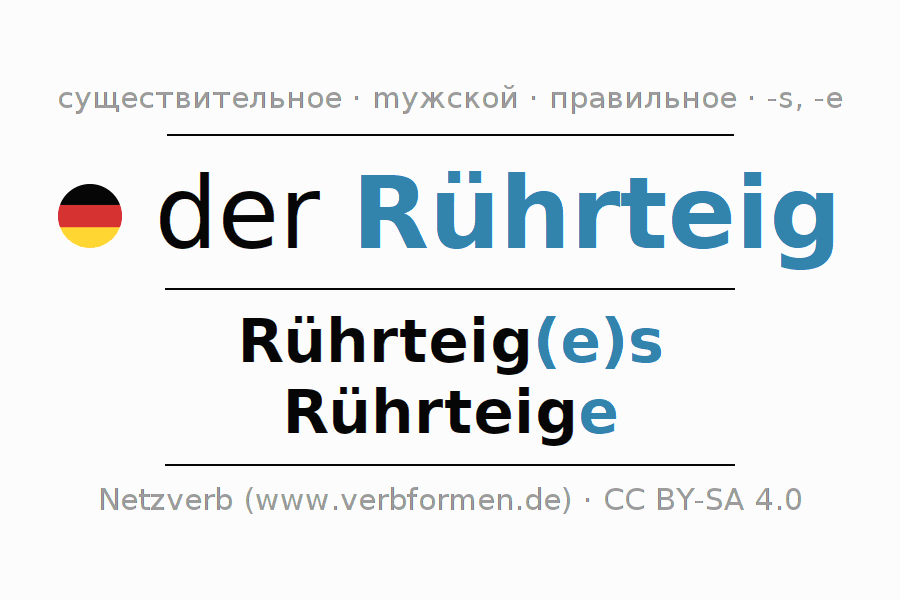 - Множественное число: die Rührteige, der Rührteige, den Rührteigen, die Rührteige