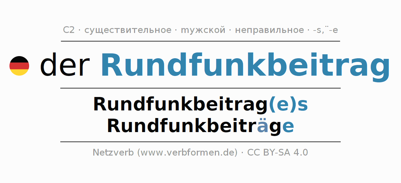- Единственное число: der Rundfunkbeitrag, des Rundfunkbeitrag(e)s, dem Rundfunkbeitrag(e), den Rundfunkbeitrag