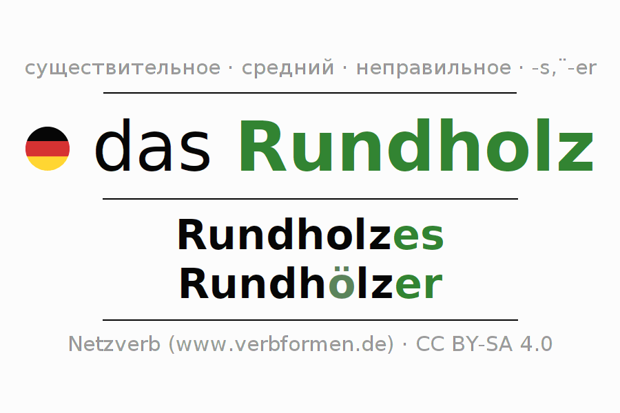 Склонение существительного Rundholz (бревно́, кру́глый лес) даётся в родительном падеже единственного числаRundholzes и в именительном падеже множественного числа Rundhölzer. Существительное Rundholz склоняется по сильному типу, получая окончания es/ö-er. Во множественном числе стоит умлаут. Грамматический род Rundholz средний с определённым артиклем "das" Здесь можно просклонять не только Rundholz, но и все немецкие существительные. Kомментарии ☆