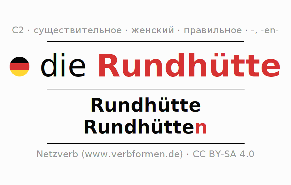 - Единственное число: die Rundhütte, der Rundhütte, der Rundhütte, die Rundhütte
