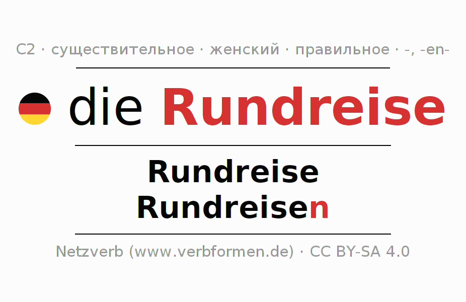- Множественное число: die Rundreisen, der Rundreisen, den Rundreisen, die Rundreisen