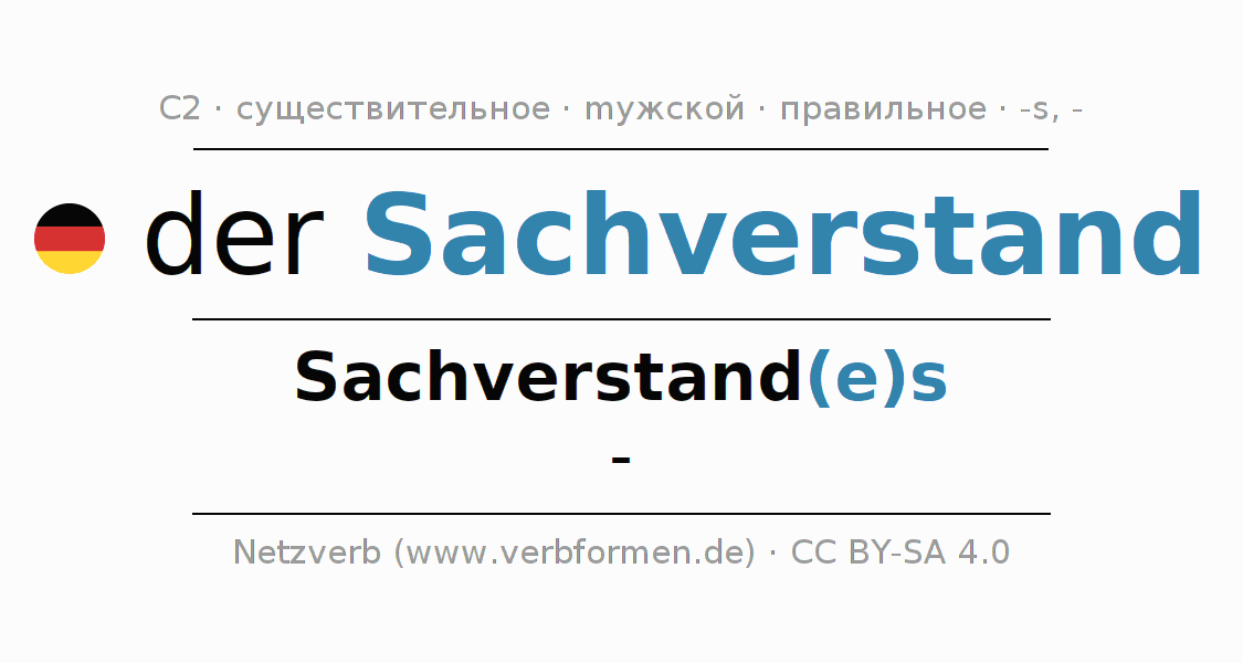 Склонение существительного Sachverstand (знание дела, знания) даётся в родительном падеже единственного числаSachverstand(e)s и в именительном падеже множественного числа -. Существительное Sachverstand склоняется по сильному типу, получая окончания es/-. Не образует форм множественного числа. Грамматический род Sachverstand мужской с определённым артиклем "der" Здесь можно просклонять не только Sachverstand, но и все немецкие существительные. Существительное включён в словарный запас обладателя сертификата знания немецкого языка уровня C2. Kомментарии ☆