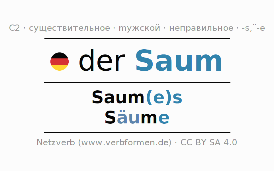 - Единственное число: der Saum, des Saum(e)s, dem Saum(e), den Saum
