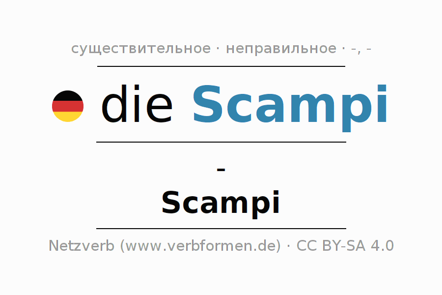 - Множественное число: die Scampi, der Scampi, den Scampi, die Scampi
