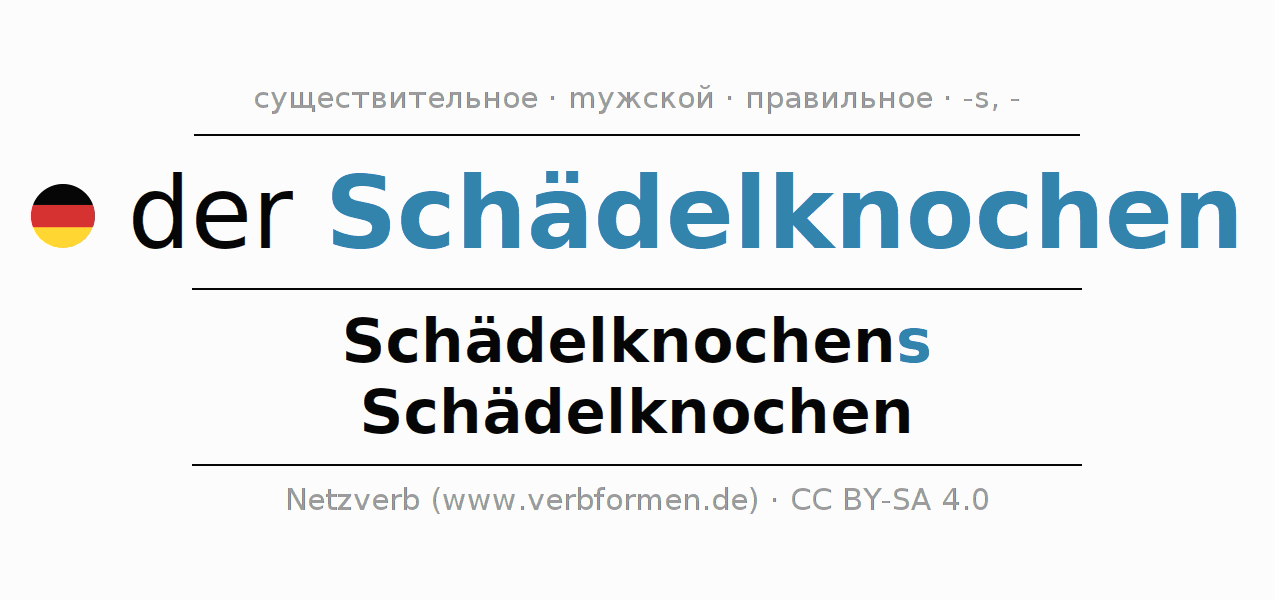 Склонение существительного Schädelknochen (черепная кость) даётся в родительном падеже единственного числаSchädelknochens и в именительном падеже множественного числа Schädelknochen. Существительное Schädelknochen склоняется по сильному типу, получая окончания s/-. Грамматический род Schädelknochen мужской с определённым артиклем "der" Здесь можно просклонять не только Schädelknochen, но и все немецкие существительные. Kомментарии ☆