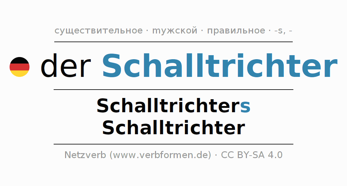 Склонение существительного Schalltrichter (звукосилитель, рупор) даётся в родительном падеже единственного числаSchalltrichters и в именительном падеже множественного числа Schalltrichter. Существительное Schalltrichter склоняется по сильному типу, получая окончания s/-. Грамматический род Schalltrichter мужской с определённым артиклем "der" Здесь можно просклонять не только Schalltrichter, но и все немецкие существительные. Kомментарии ☆