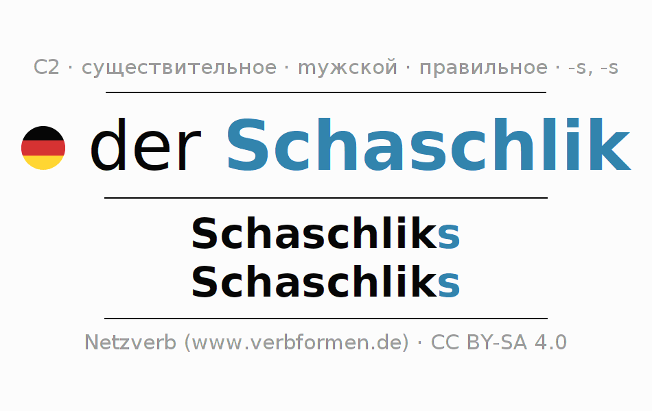 Склонение существительного Schaschlik (шашлык, шашлы́к) даётся в родительном падеже единственного числаSchaschliks и в именительном падеже множественного числа Schaschliks. Существительное Schaschlik склоняется по сильному типу, получая окончания s/s. Грамматический род Schaschlik мужской с определённым артиклем "der" Однако существительное может употребляться в другом роде и с другим артиклем. Здесь можно просклонять не только Schaschlik, но и все немецкие существительные. Существительное включён в словарный запас обладателя сертификата знания немецкого языка уровня C2. Kомментарии ☆