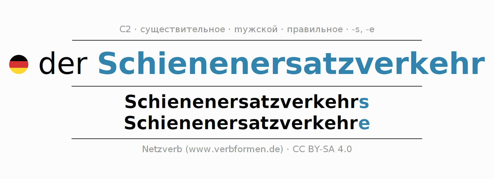 - Единственное число: der Schienenersatzverkehr, des Schienenersatzverkehrs, dem Schienenersatzverkehr, den Schienenersatzverkehr