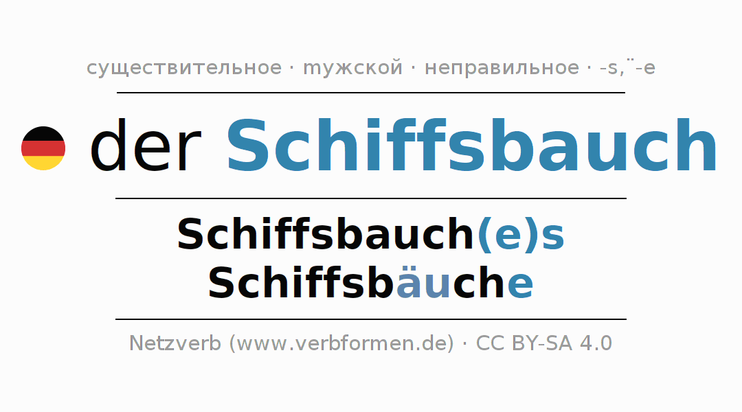 Склонение существительного Schiffsbauch (ко́рпус корабля́, трюм корабля́) даётся в родительном падеже единственного числаSchiffsbauch(e)s и в именительном падеже множественного числа Schiffsbäuche. Существительное Schiffsbauch склоняется по сильному типу, получая окончания es/äu-e. Во множественном числе стоит умлаут. Грамматический род Schiffsbauch мужской с определённым артиклем "der" Здесь можно просклонять не только Schiffsbauch, но и все немецкие существительные. Kомментарии ☆
