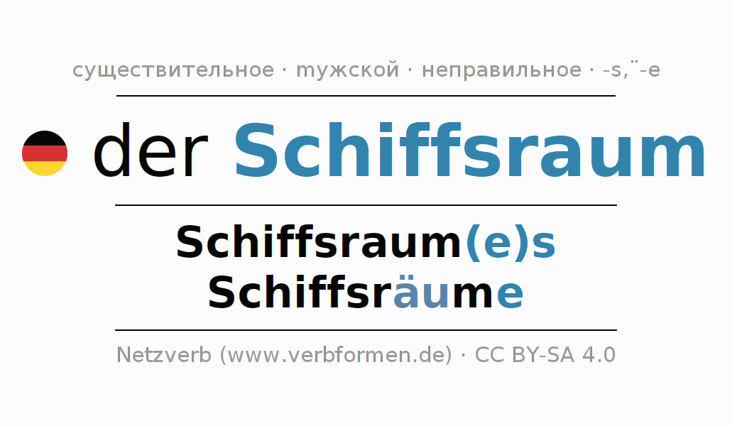 - Множественное число: die Schiffsräume, der Schiffsräume, den Schiffsräumen, die Schiffsräume