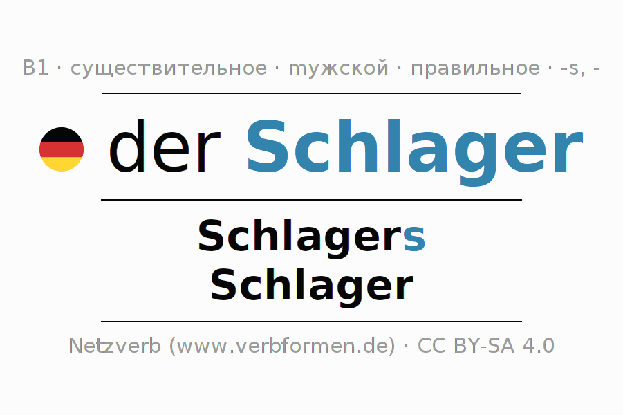 - Множественное число: die Schlager, der Schlager, den Schlagern, die Schlager