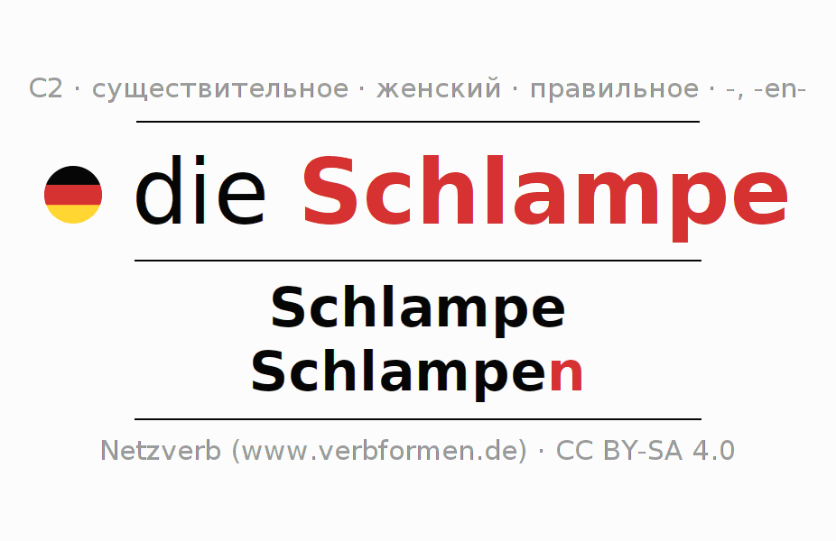 Склонение существительного Schlampe (блядь, шлюха) даётся в родительном падеже единственного числаSchlampe и в именительном падеже множественного числа Schlampen. Существительное Schlampe склоняется по слабому типу, получая окончания -/n. Грамматический род Schlampe женский с определённым артиклем "die" Здесь можно просклонять не только Schlampe, но и все немецкие существительные. Существительное включён в словарный запас обладателя сертификата знания немецкого языка уровня C2. Kомментарии ☆