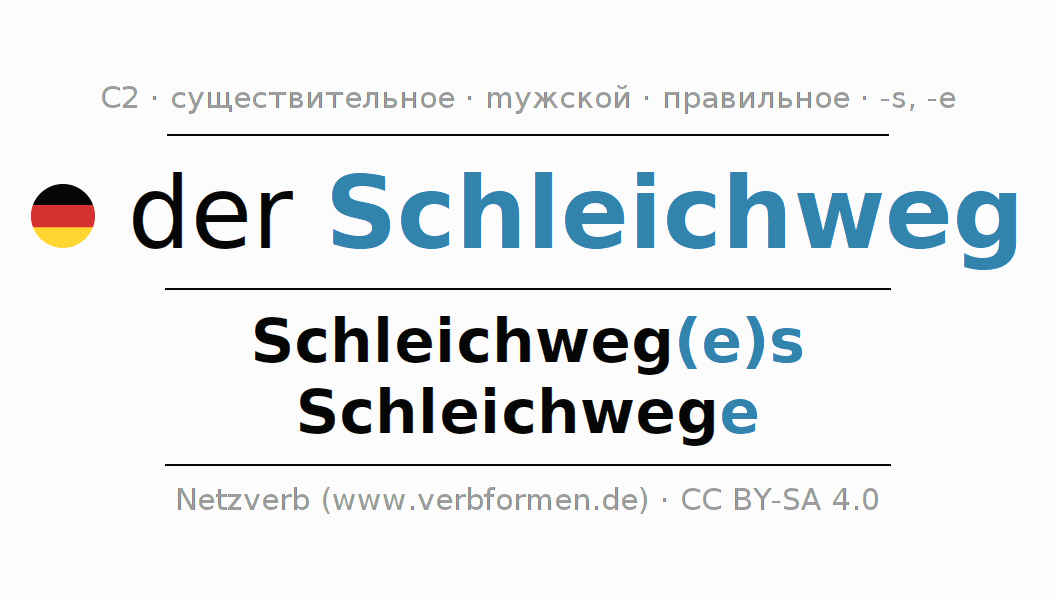 - Единственное число: der Schleichweg, des Schleichweg(e)s, dem Schleichweg(e), den Schleichweg