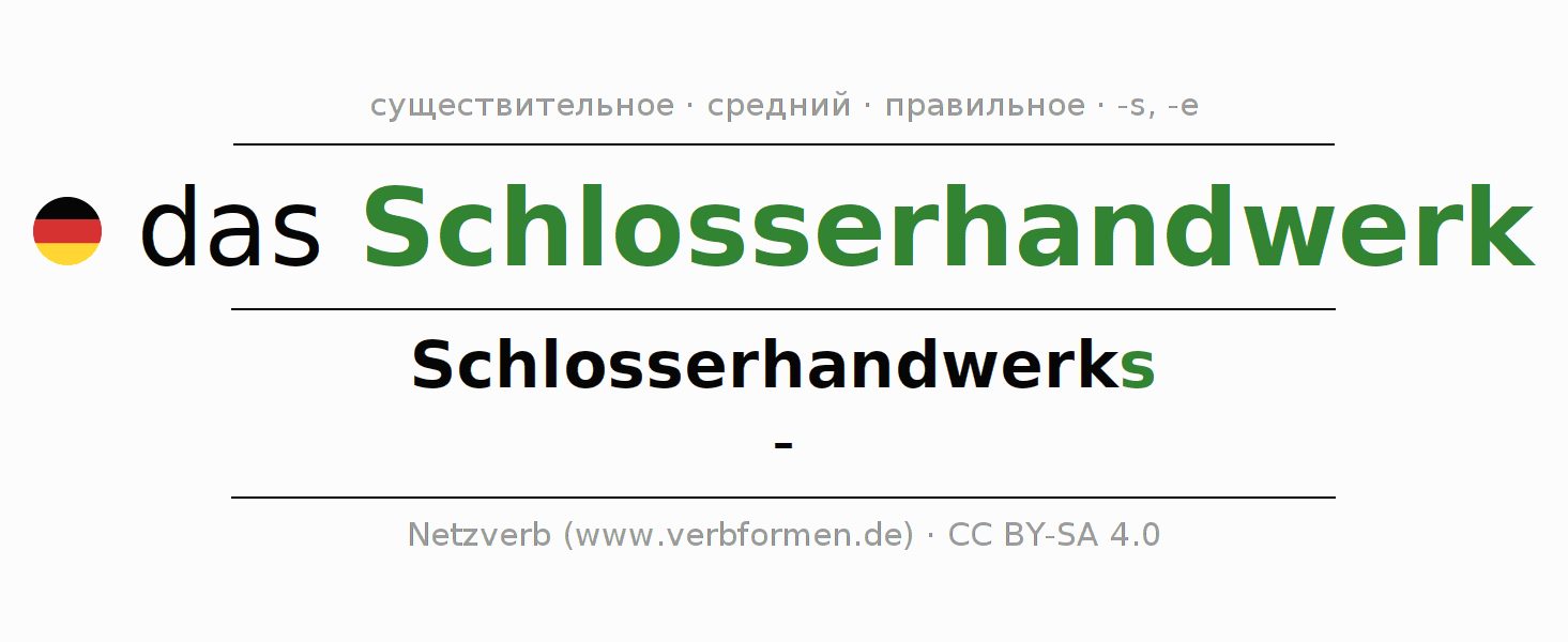 Склонение существительного Schlosserhandwerk (металлообработка, слеса́рное де́ло) даётся в родительном падеже единственного числаSchlosserhandwerks и в именительном падеже множественного числа -. Существительное Schlosserhandwerk склоняется по сильному типу, получая окончания s/-. Не образует форм множественного числа. Грамматический род Schlosserhandwerk средний с определённым артиклем "das" Здесь можно просклонять не только Schlosserhandwerk, но и все немецкие существительные. Kомментарии ☆