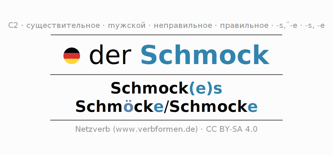| Дат. | dem Schmock(e) | den Schmöcken/Schmocken |